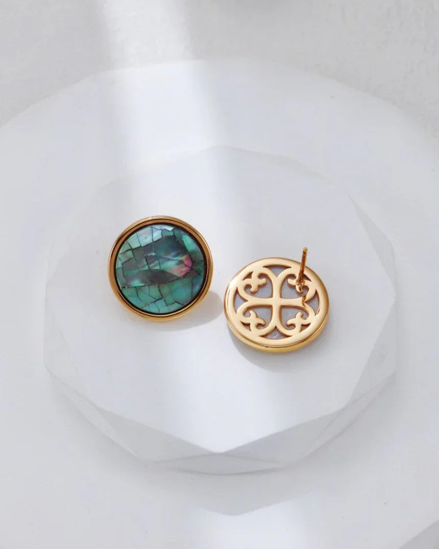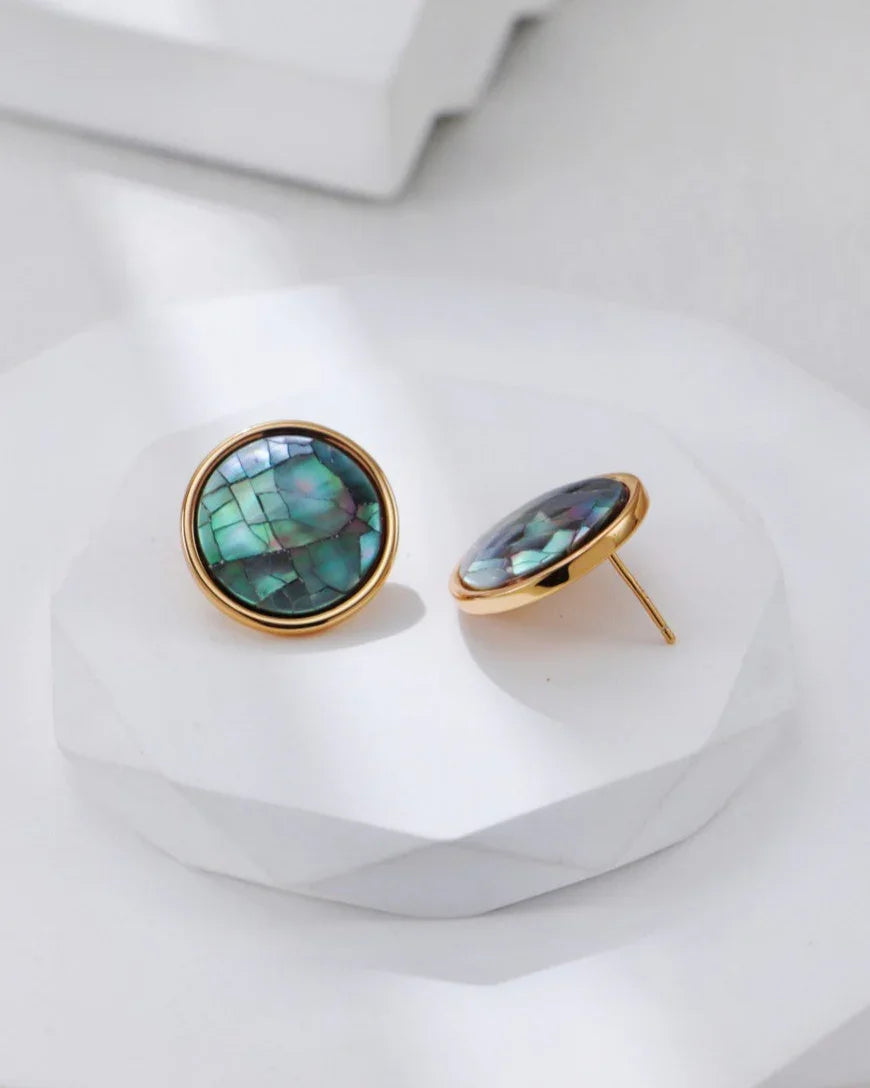 The Aurora Shell Crackle Earrings feature iridescent shell surfaces with natural cracks, reflecting a rainbow-like glow under the light. Each shell reveals unique textures and colorful shimmer, making every piece one of a kind. The vintage gold-plated frame complements the vibrant shell, creating a harmonious balance of elegance and ocean-inspired charm. Distinctive and refined, these earrings bring both artistry and nature’s beauty into a timeless accessory.