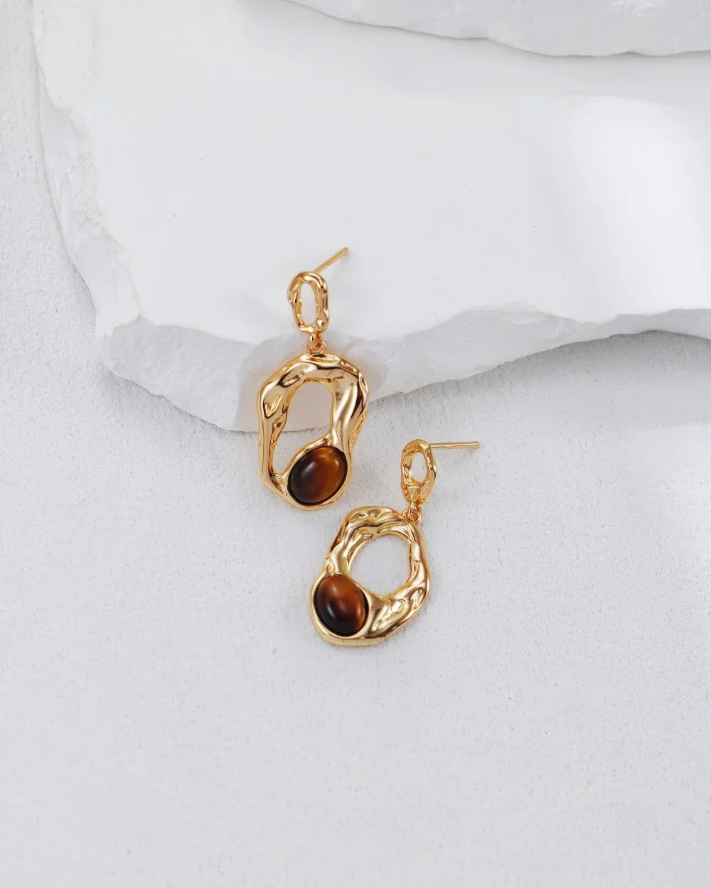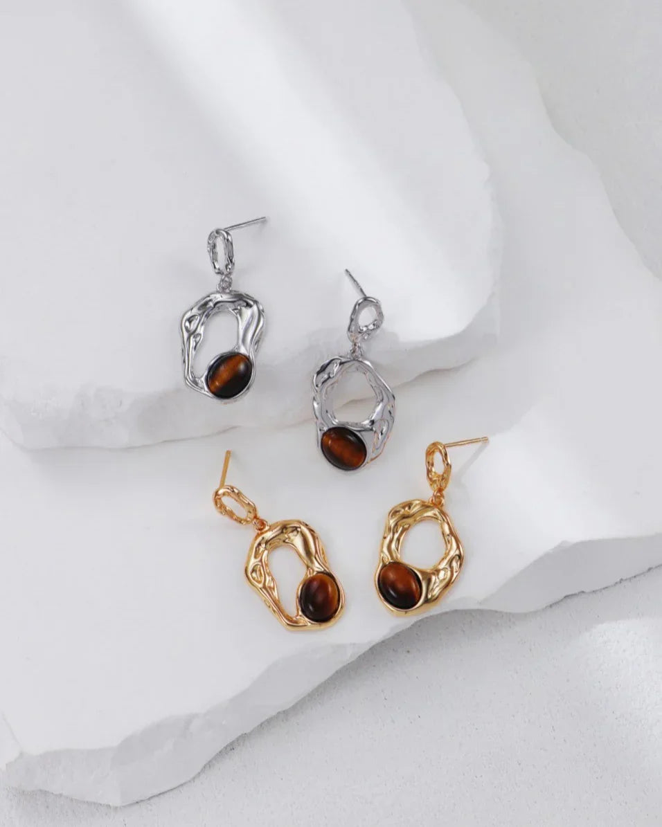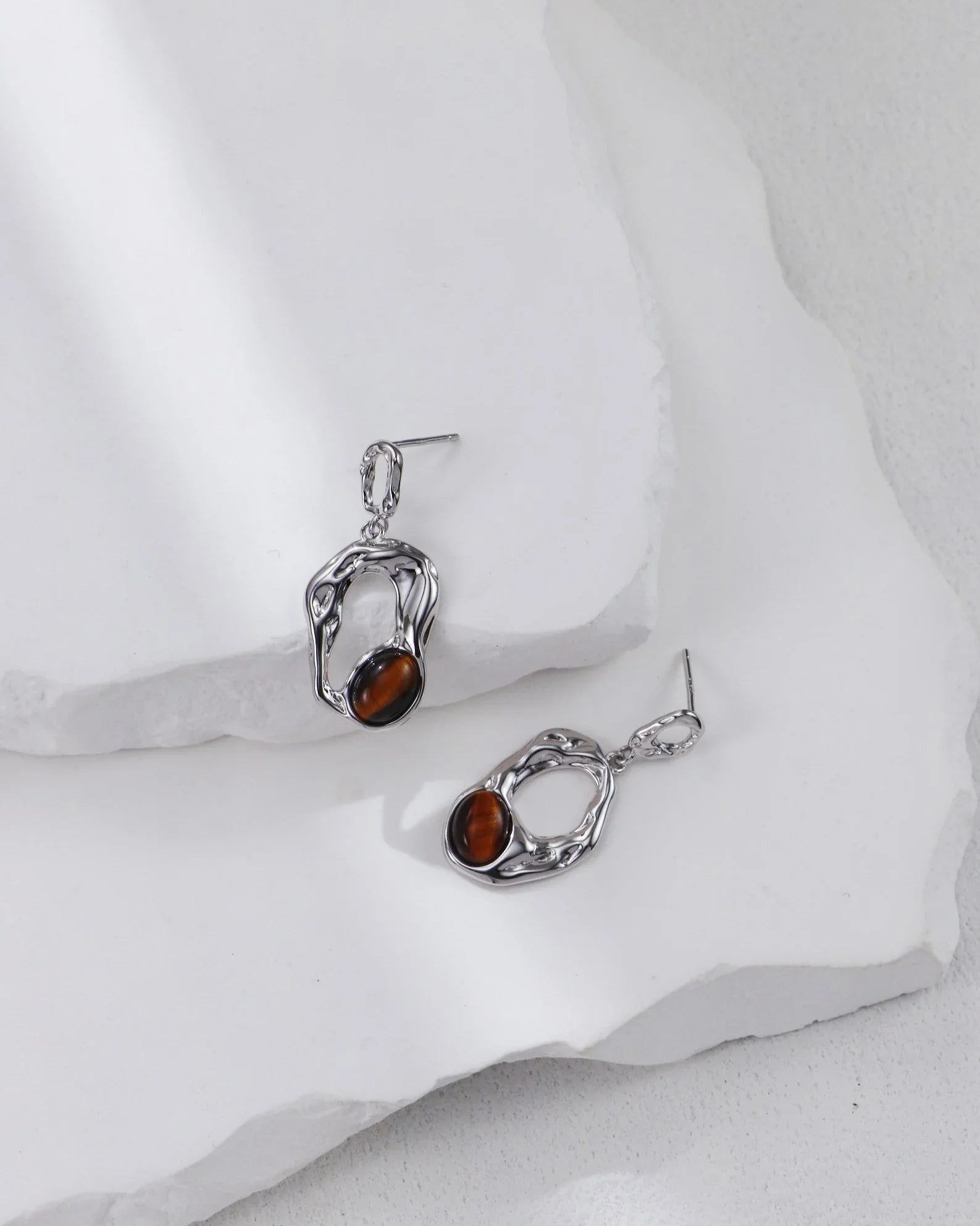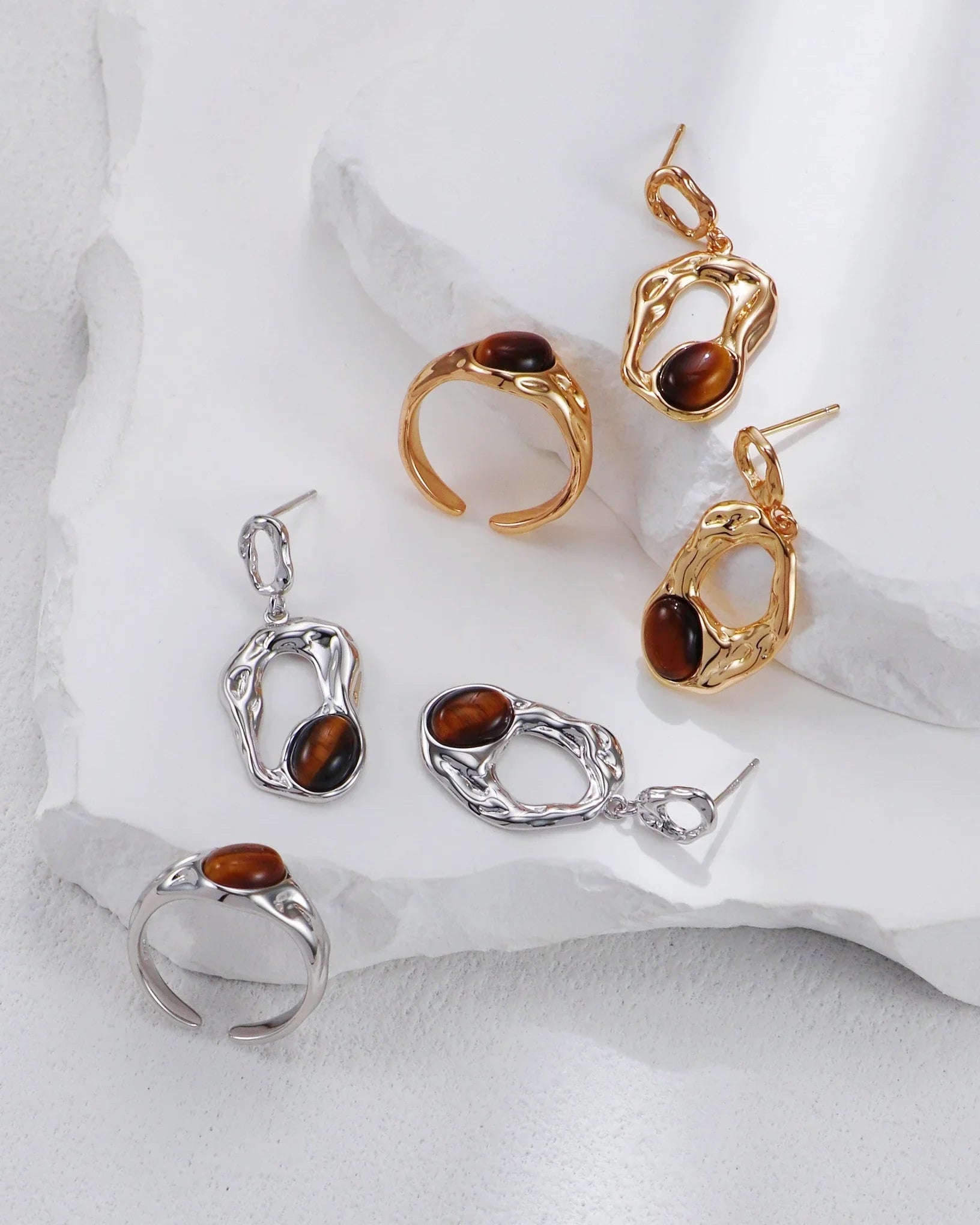 Silver lines flow like moonlight, tracing a graceful, effortless silhouette. At the center, tiger’s eye glimmers like an ancient fallen star, radiating both mystery and warmth. The contrast of luminous silver and deep golden stone creates a design that is timeless, elegant, and full of celestial charm.
