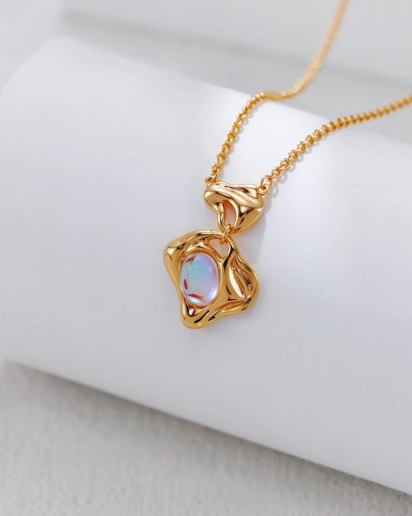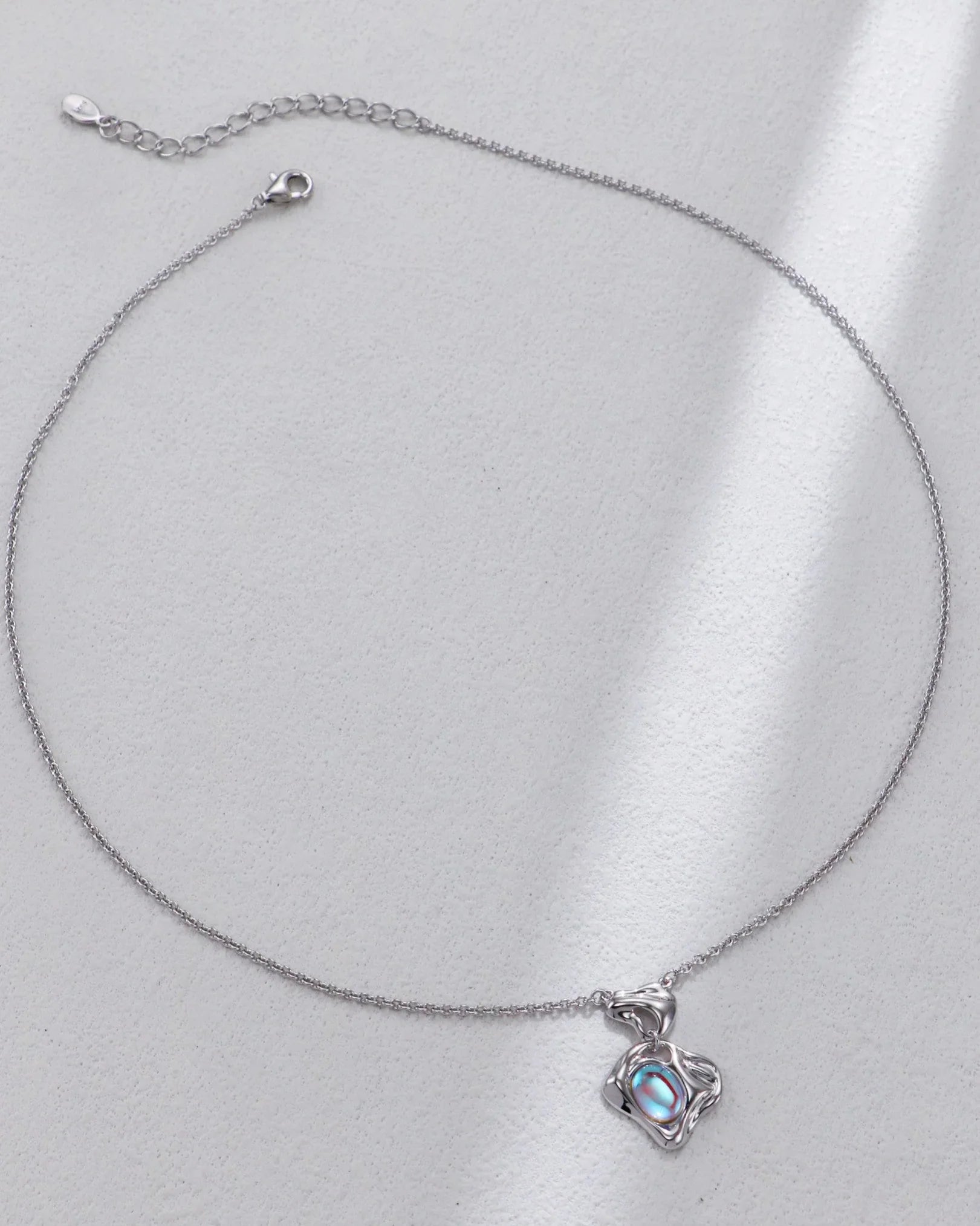 The moonstone’s natural adularescence — its soft blue-pink glow — shifts gently under the light, like moonlight rippling across still water. The luminous effect awakens inner peace and reflection.