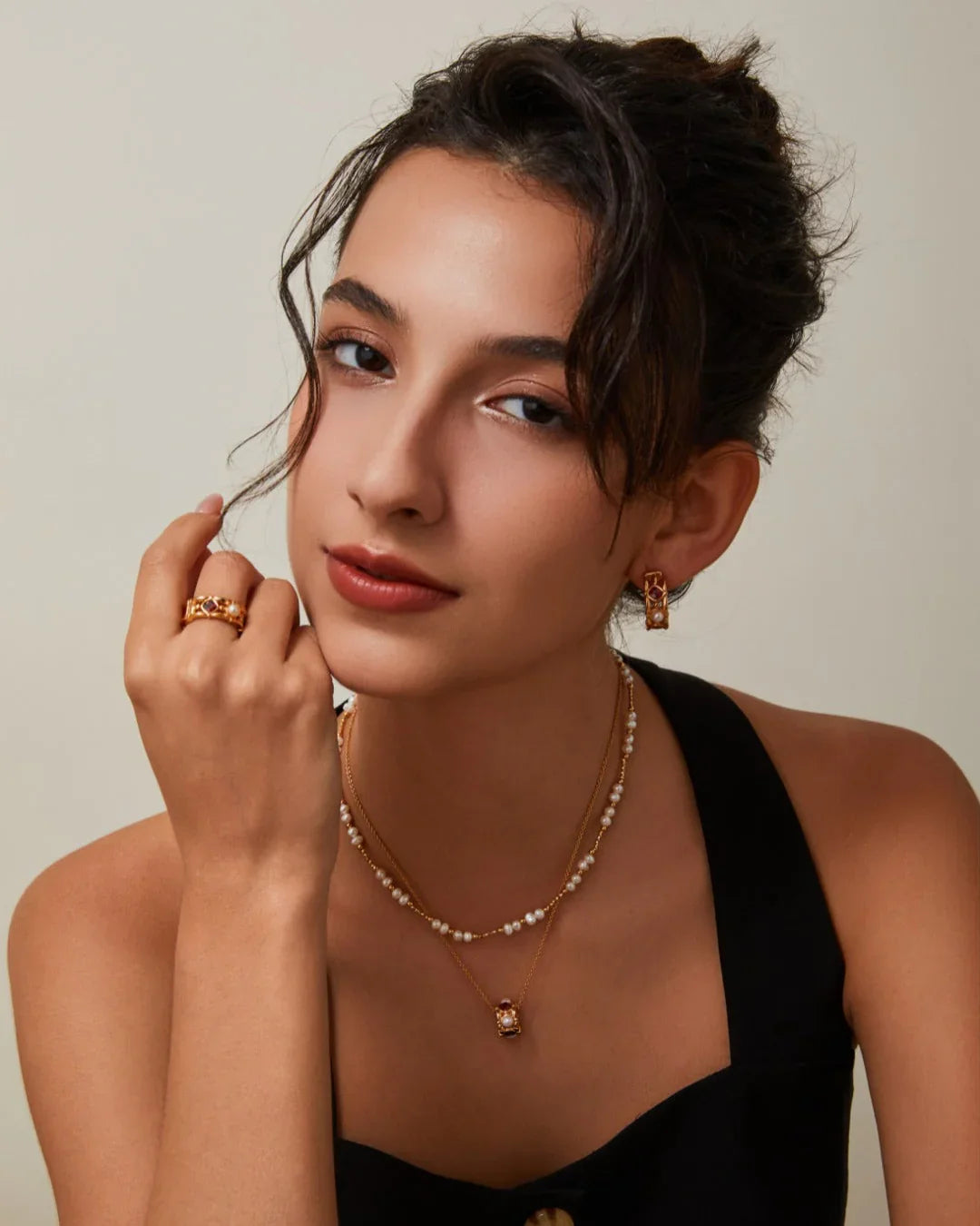 The Scarlet Pearl Flame Set brings together a necklace, ring, and earrings designed in perfect harmony. Each piece combines luminous pearls with vibrant red zircon, creating a striking contrast of softness and fire.