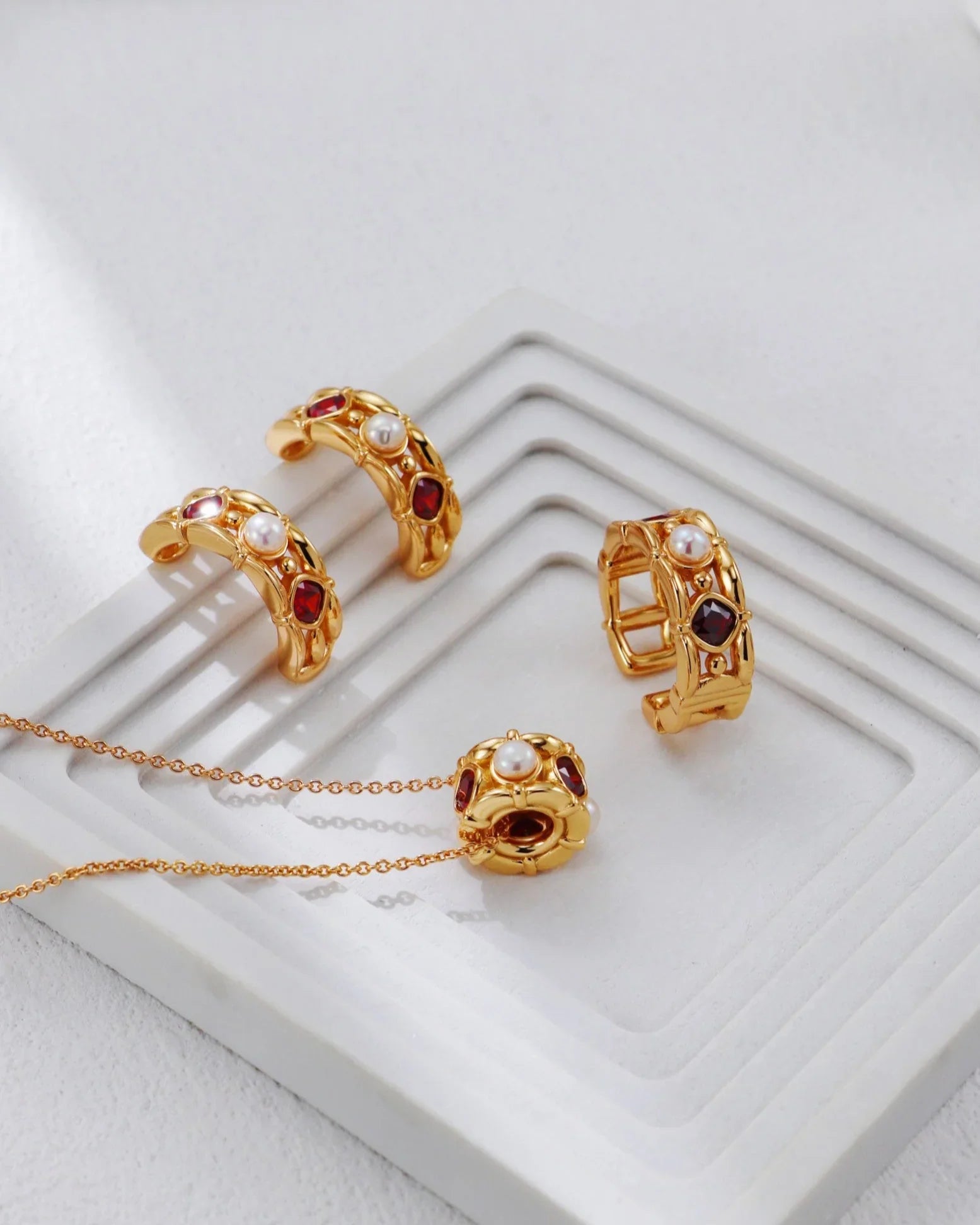 Together, the pearls and red zircon symbolize harmony—serenity meeting passion, elegance embracing strength. A jewelry set that is not only beautiful but also a statement of individuality and refined taste.