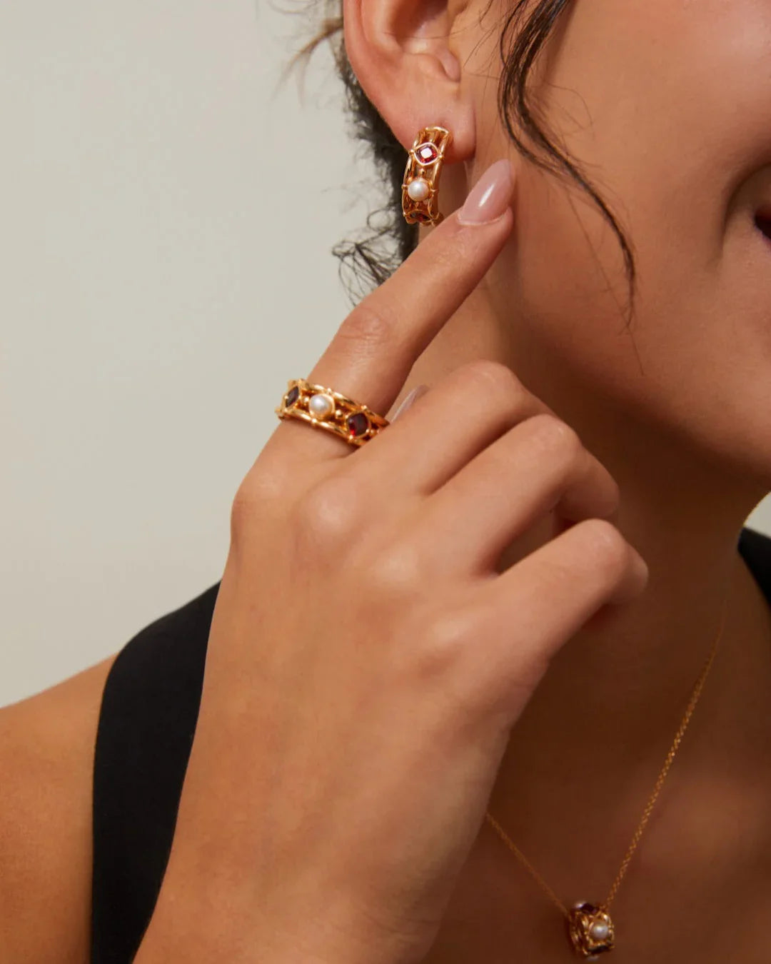 The Ring: Unique linear design, balancing the smooth elegance of pearls with the brilliance of red zircon.